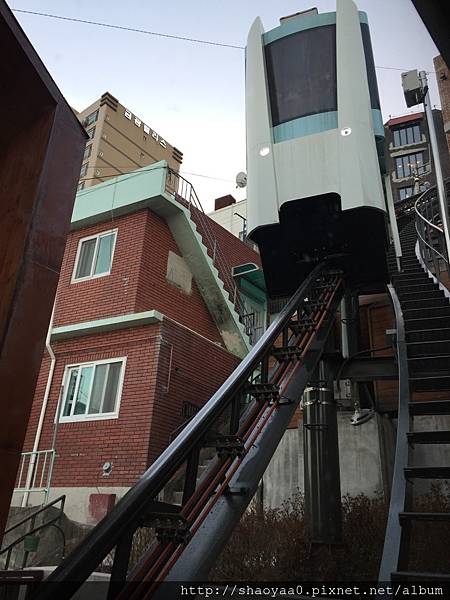 這長長的樓梯,讓身為旅人的我心裡頭又是一驚,但現在不用擔心了,往旁邊一看,居然有這剛開始啟用不久的迷你型單軌車。