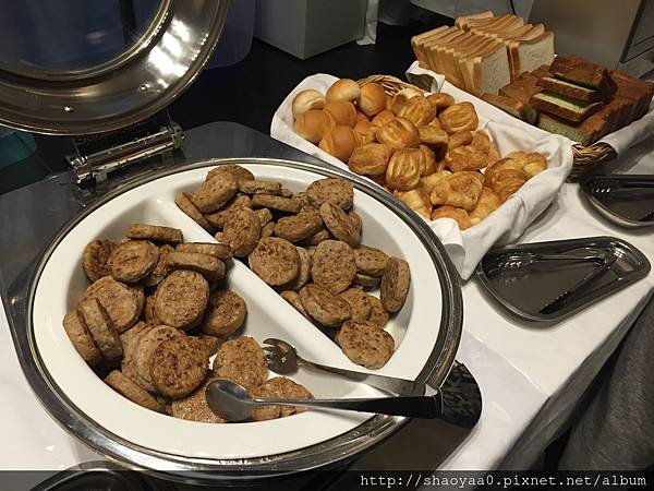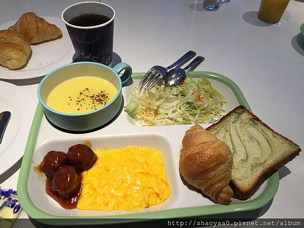 早餐走小而巧路線,每天的菜色會有一點點的不同,但大至上相同,會有一大盆綜合高麗菜絲、不同口味的吐司還有牛角麵包,湯品的種類會有玉米濃湯和味曾湯兩種口味在互換,再搭配二到三種的配菜,比如肉餅、肉丸、煎蛋等。另外,飲品的部分有黑咖啡、茶、牛奶和果汁。整體來說和星級數飯店的餐點比起來種類不算多,但是在份量和口味上都算還不錯。