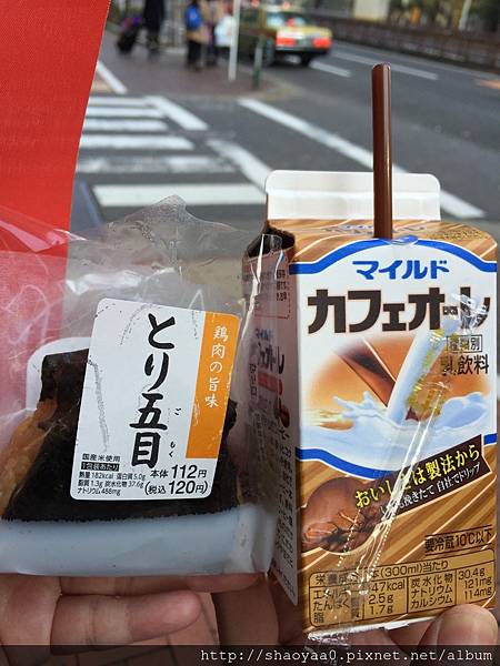 順帶一提,商店是宵夜好去處,也是早餐的好幫手,有時太早出門或是趕時間搭車時,隨手在商店買早餐超方便。這個咖啡牛奶和雞肉口味的御飯團滿足早晨的心靈。