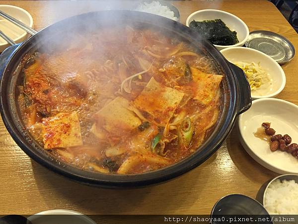 真的蠻大鍋的,滿滿的泡菜舖底,裡頭有拉麵、魚板、少許豬肉、年糕等,湯頭酸辣濃郁的重口味,完全可以抵抗外頭的冷天氣,只是不適辣的朋友可能會噴火。如果有機會來嚐嚐,這鍋真的好吃,我蠻愛的。