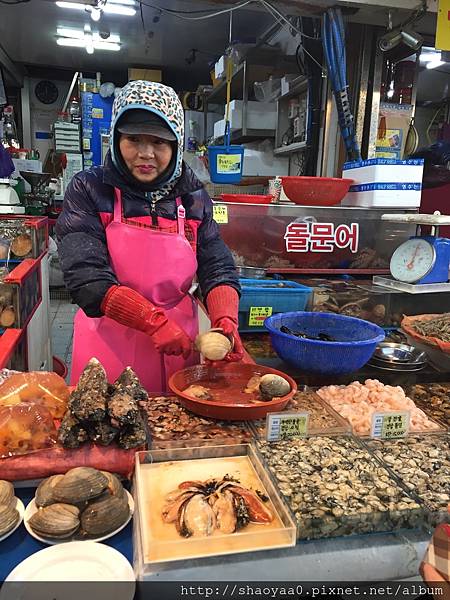 再往裡面走去,有一條販賣熟食的街,會有很多阿姨用著精神無比的嗓門邀喝作生意,我想在這品嚐到的美食就是最道地的韓國味,很喜歡這樣融入生活的旅行方式。