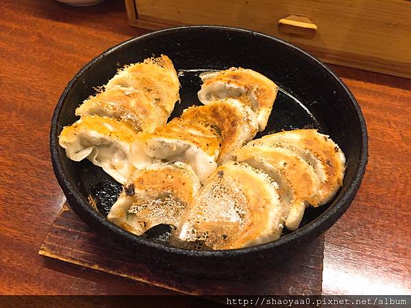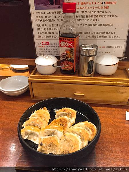 福岡遠近馳名的鐵鍋煎餃,搭配餃子專用的醋醬和九州盛產調味料「柚子胡椒」。